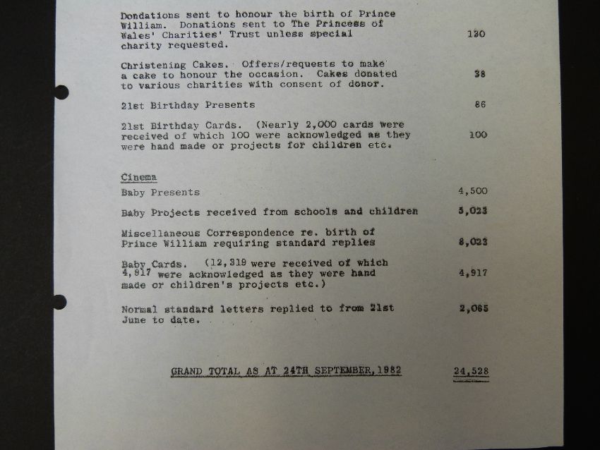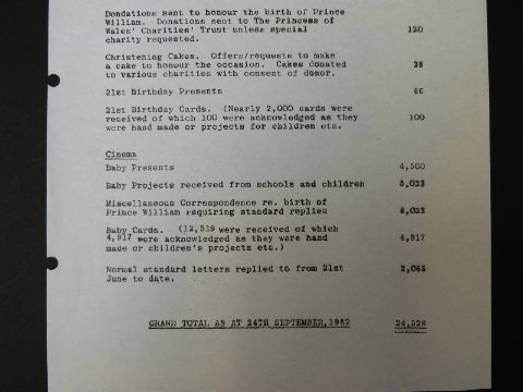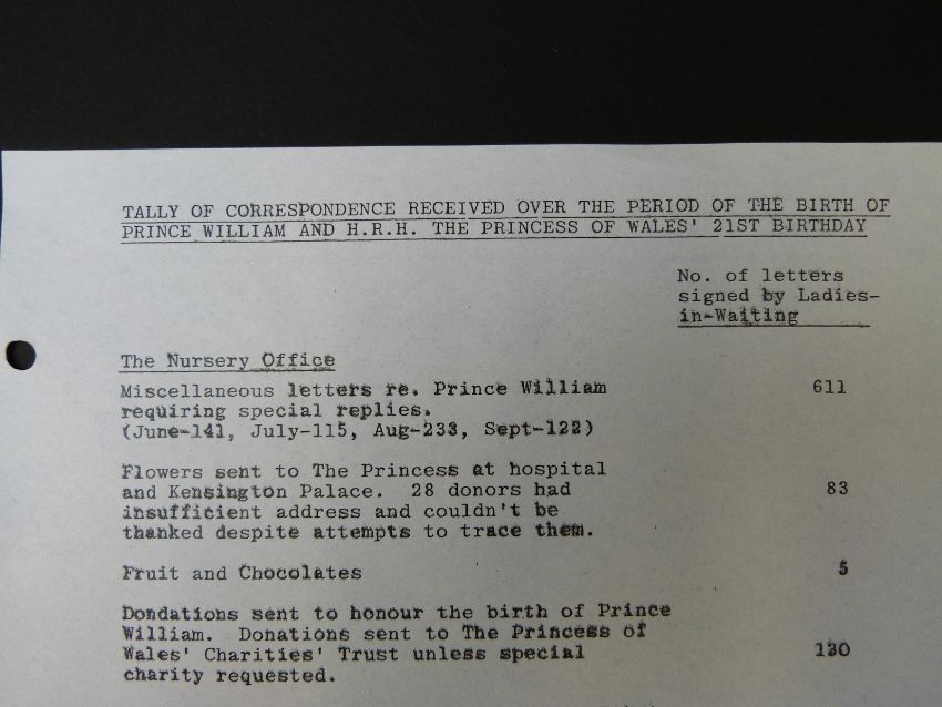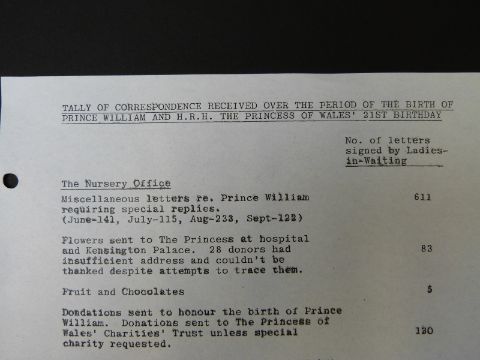 A typed 'tally of correspondence received over the period of the birth of Prince William and HRH The Princess of Wales' 21st Birthday'; an interesting record of the level of interest in the Royal family, detailing eighty three gifts of flowers, four thousand five hundred baby presents, over 24,000 thank you letters sent by the ladies in waiting.
