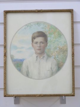 An early 20thC watercolour head and shoulders portrait of a young boy, pencil script possibly J Sherbourn Longman, Cheltenham, diameter 26cm
