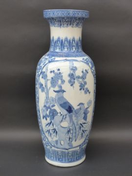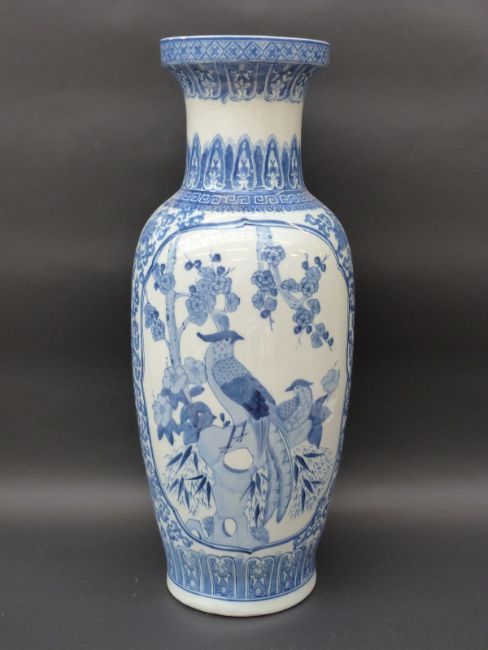 A Chinese blue and white floor vase decorated with peacocks and flowers, 80cm tall