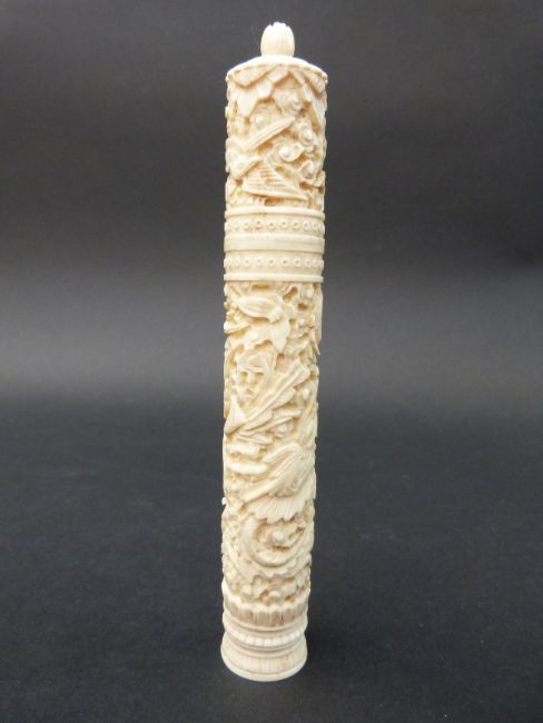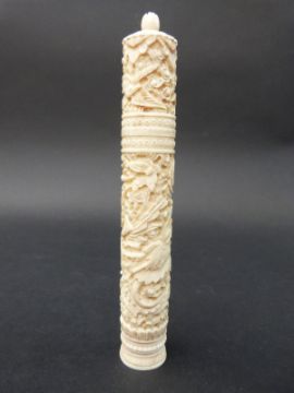 A 19thC carved bone needle case decorated with dragons, 16cm long