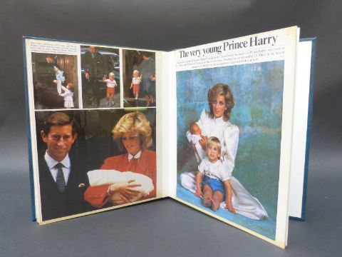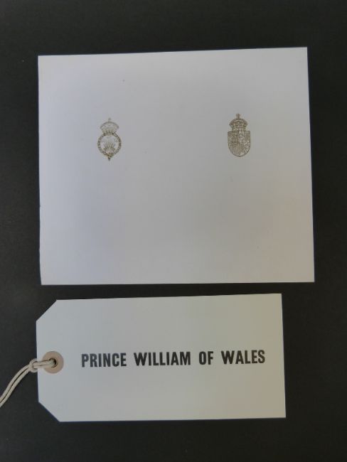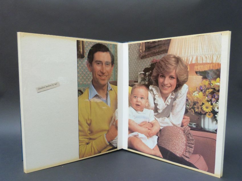 A scrap book containing a luggage tag 'Prince William of Wales', half an official Christmas card and various colour clippings of the Royal Family