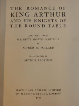 Arthur Rackham illustrated, The Romance of King Arthur and His Knights of the Round Table (London, Macmillan, 1917) 16 colour illustrations, 7 full page drawings, 63 drawings in text, dark blue cloth. First edition, first printing