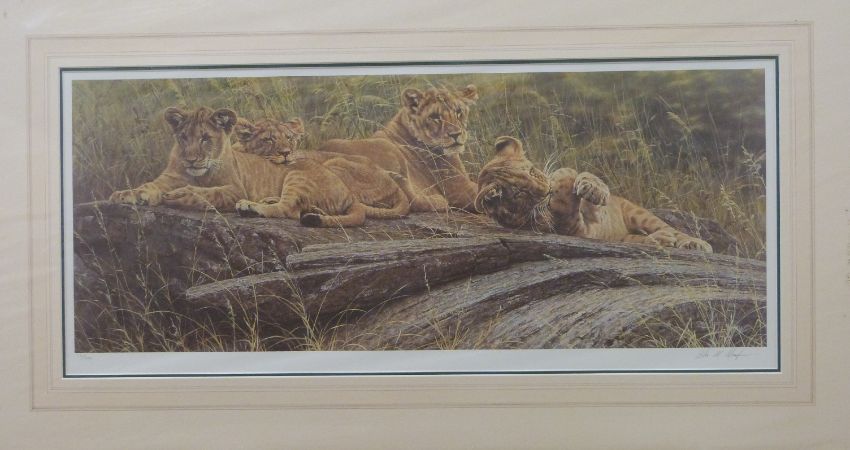 Alan M Hunt signed limited edition print 72/950 untitled but lions and cubs at rest 33x81cm
