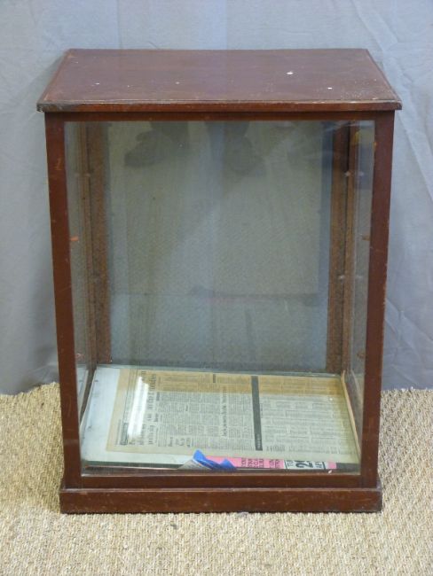 A glazed mahogany display cabinet, shop fitting/ haberdashery interest (W50 x L41 x H65cm)