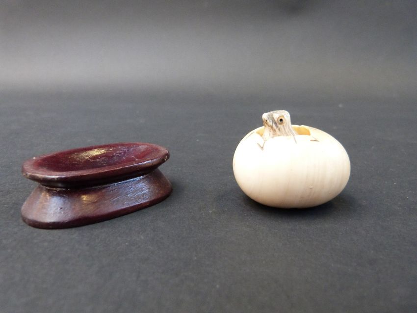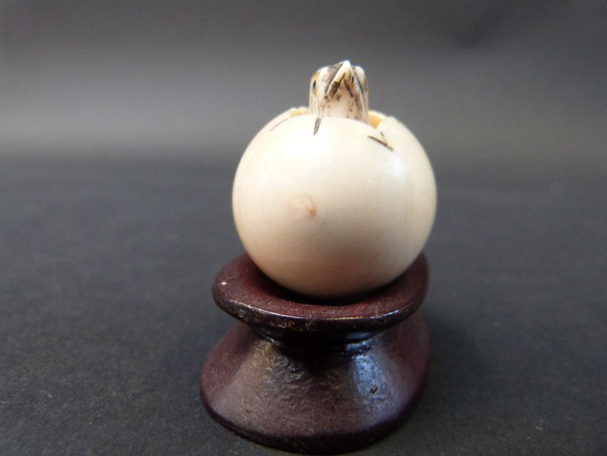 A Japanese carved ivory netsuke of a chick emerging from an egg on a wooden plinth, 5cm tall
