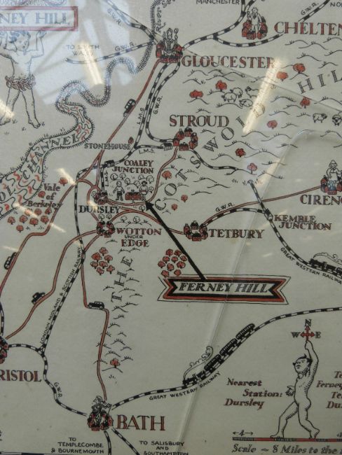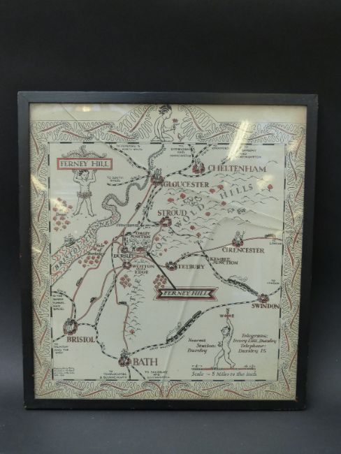 A framed map of the local Gloucester area featuring the GWR railway, roads etc. including Stroud, Dursley, Cirencester etc. marked to lower left corner 'made by Herry Perry finished on the feast of St John at the Latin Gate 1930', Perry designed Art Deco posters and maps for the London Underground circa 1928 to 1937, 34x31cm