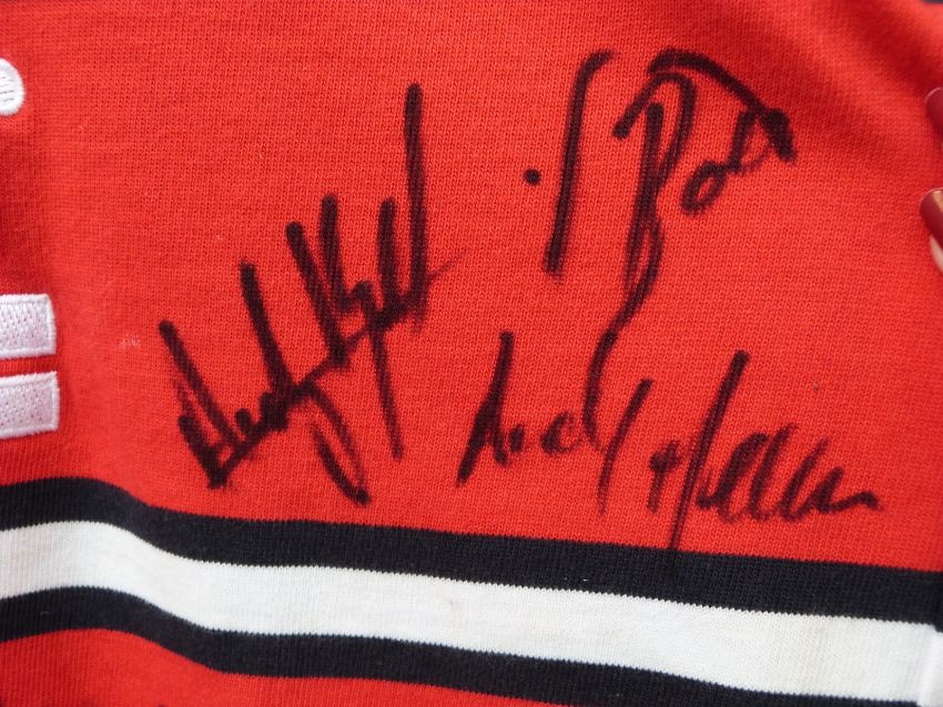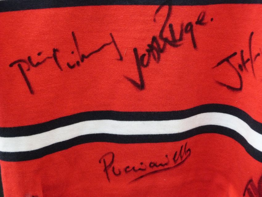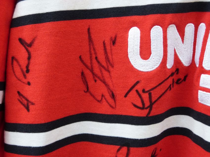 A Gloucester Rugby signed shirt, signatures include Andy Gomarsall, Adam Eusace, Phil Vickery, Andy Hazell