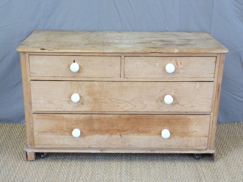 A 19thC pine chest of four drawers with white porcelain handles (W120 x D54 x H73cm)