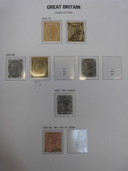 A Stanley Gibbons album of Great Britain stamps 1840-1970. Contains many good quality stamps including 1d black and 2d blue, both 4 margins, 1847-54 embossed x 4, 1870 1/2d rose red used plate 9, selection surface printed issues, including 1880-83 2 1/2d blue plate 22x2, 1872-73 6d pale chesnut plate II, 1873-80 6d grey plate 14 all mint, 1855-57 6d pale lilac used pair with scarce Broomielow postmark, 1867 5s pale rose x 2, a fine 1883 1/2d-1s set mint, 1883-84 high values including £1 brown lilac (three crowns) used 1887-1900 Jubilee set including £1 green used, also jubilee 2d, 5d, 6d and 10d mint blocks, Edward VII mint stamps, 1902-13 including 2/6d and 10s mint. Also £1 deep green used. 1937-1970 sections well-filled with mint stamps. High overall catalogue value