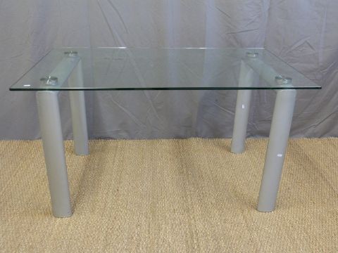 A modern glass topped table and three chairs (L138 x W78 x H75cm)