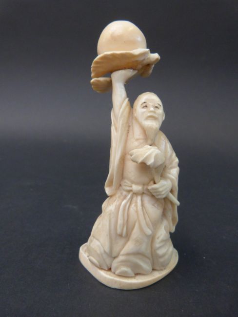 A Japanese carved ivory figure of a man holding fruit aloft, 11cm tall