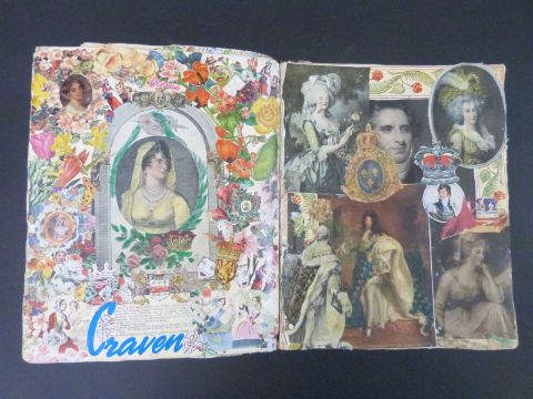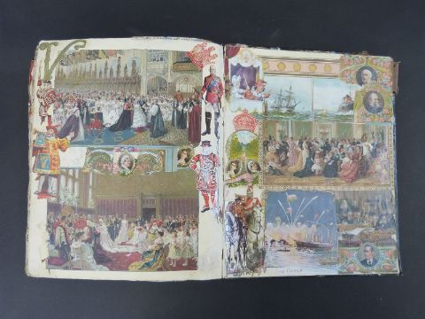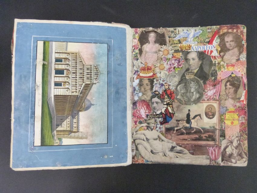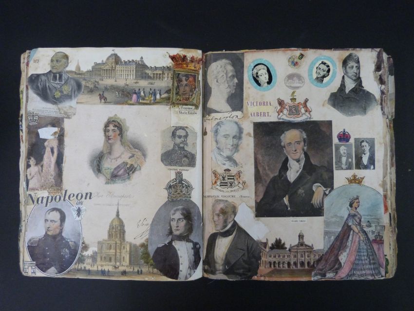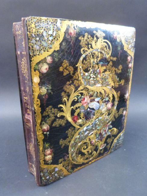 A Victorian papier mache scrap album with mother of pearl inlay dated 1857 with armorials, lithographs, illuminated announcement 'Lavina Mary Stapleton on the occasion of her marriage 19th July 1953' Victoria, Albert, Napoleon, Wellington, India, Lord Byron signature, poets, the arts, Scottish watercolours, Lothian, embossed card, Duke of Marlborough crest, Tennyson, Nelson card, watercolours of Sound of Sleet, Skye, Duncraig castle, Baxter prints including Great Exhibition, Thornbury Castle engraving. Lavinia Stapleton, the likely owner of this album married Alexander Matheson MP, hand painted invitation is in the album, Seaforth Highlanders interest, further Scottish watercolours, Loch Duich etc. all relate to one family