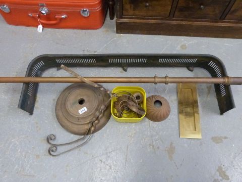 A brass and copper standard lamp, brass fender and a letterbox