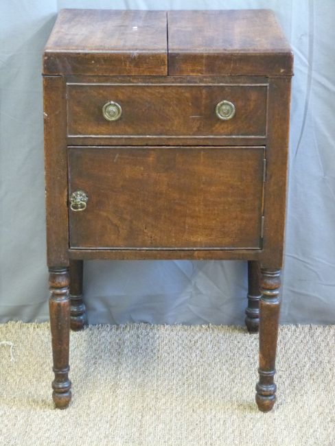 A Georgian mahogany washstand/bedside cabinet with hinged flaps to top and cupboard to base (W48 x H78cm)