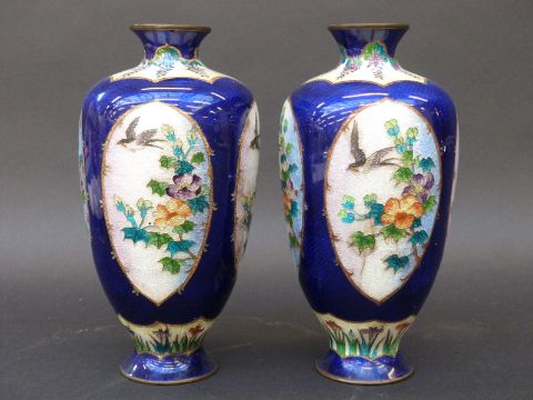A pair of Japanese Ginbari enamel vases with bird and flower decoration on blue ground (18.5cm tall)
