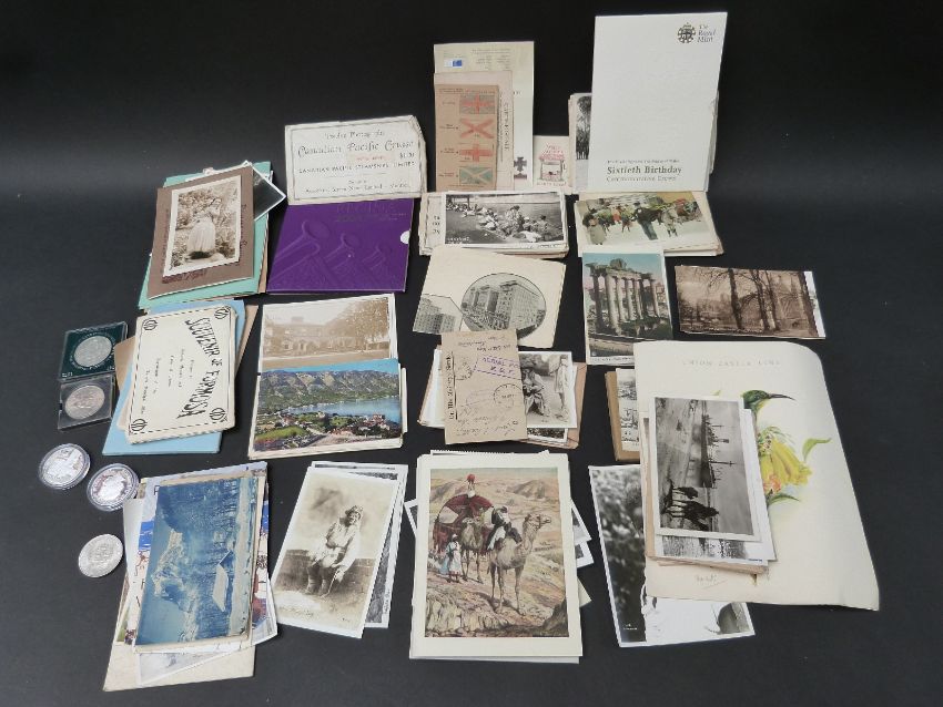 A collection of postcards including early 20thC Chinese, Aboriginal & other tribal, world crime, Union Castle and Canadian Pacific ephemera etc and three various commemorative five pound coins etc