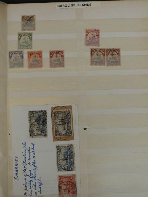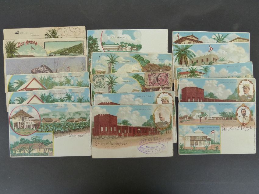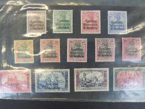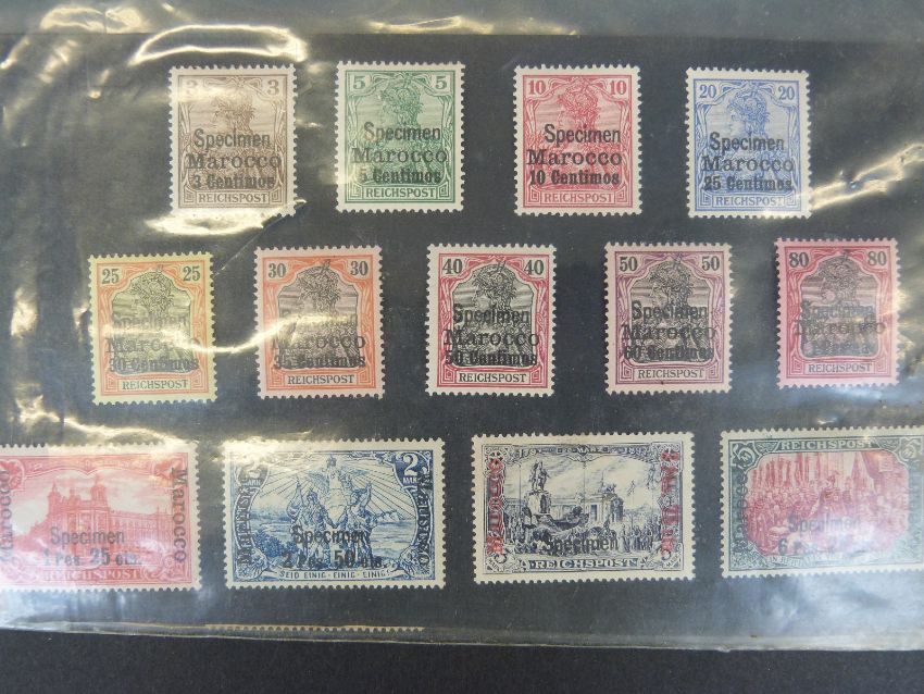 Kiautschou, Mariana Islands, Togo, Morocco, East Africa and Germany. A good range of mint sets of "Specimen" overprinted stamps together with an interesting collection of early greetings cards from German Colonies and a stockbook of mint and used "Yacht" stamps