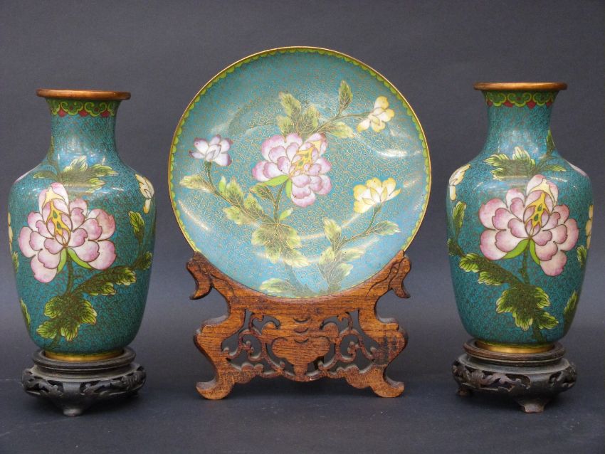 A pair of late 19th/20thC cloisonne vases on wooden bases, 20cm tall, and matching plate on a stand, 17cm in diameter