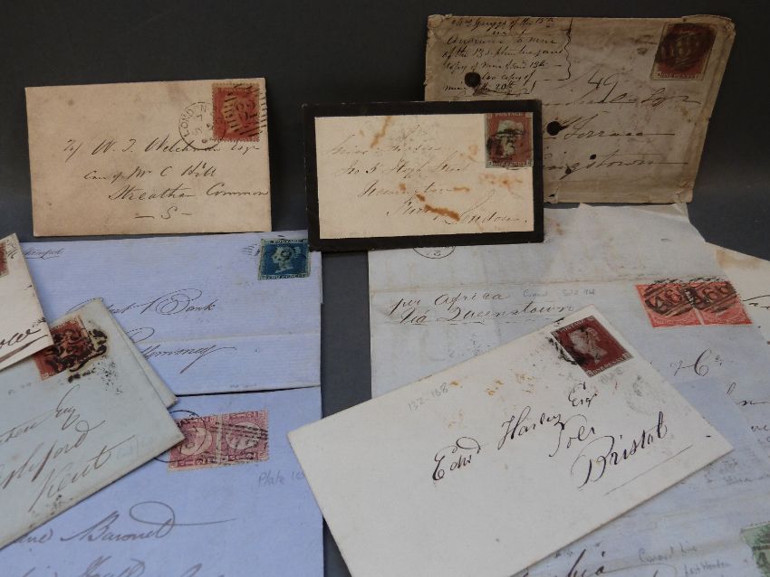 A selection of GB Victorian stamps on cover including two 1841 2d blue, 1d red brown etc