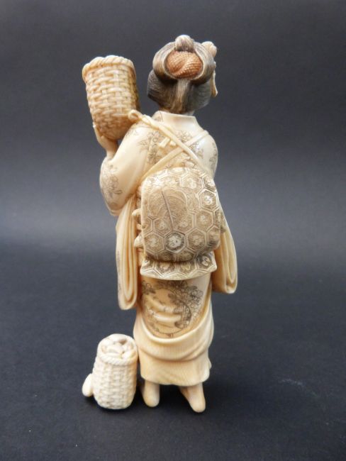 A Japanese Meiji period carved ivory okimono of a lady carrying a basket of clams, 13.5cm tall