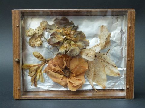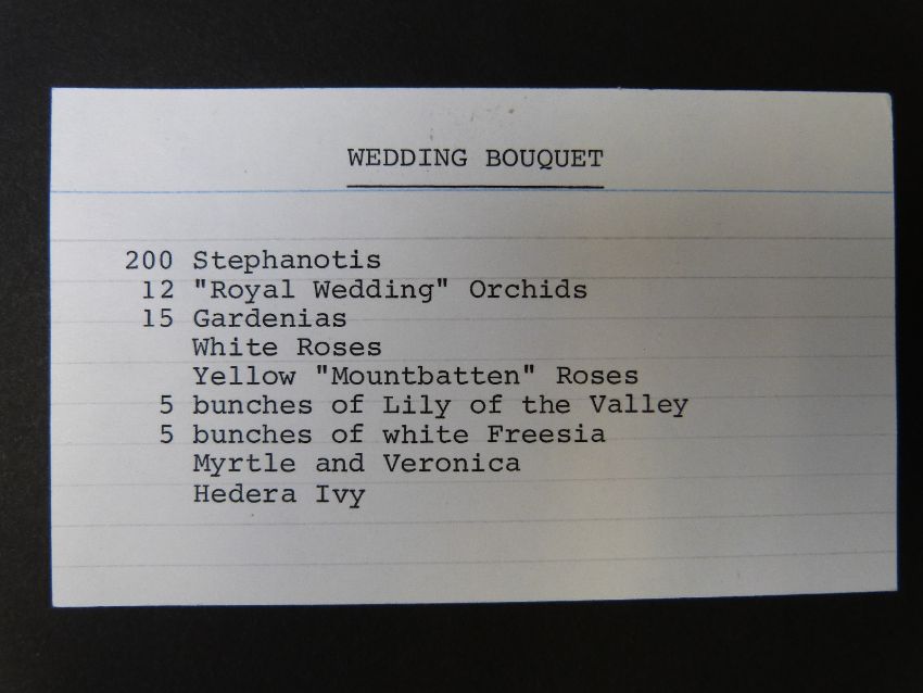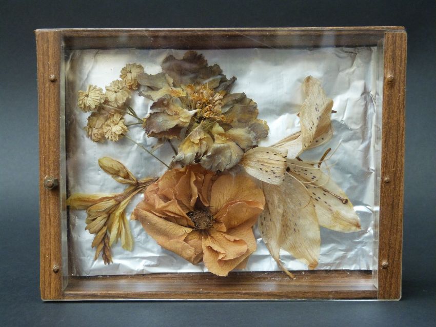 Dried flowers from the wedding bouquet of HRH Diana, Princess of Wales, in foil backed display case with list of the flowers used in the creation of the bouquet