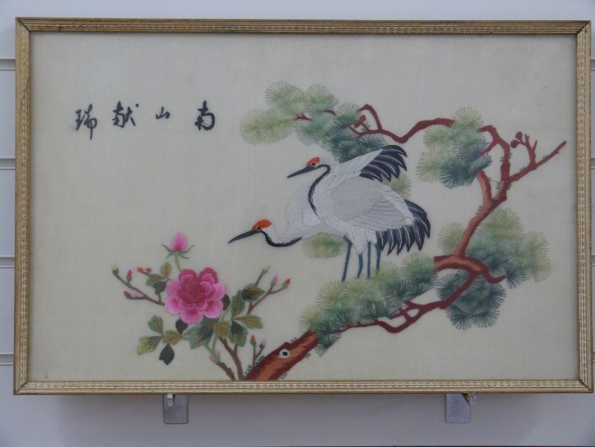 A Chinese embroidery on silk of birds on a branch with script top left, 35x55cm