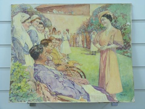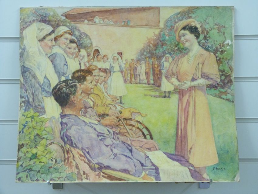 S Rankin watercolour of the Queen Mother talking to recovering soldiers and nurses at a military hospital c. 1940's, 41x51cm