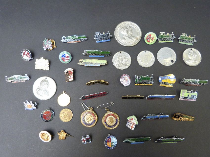 Thirty two enamlled railway associated badges, together with 19th century commemorative medals including Grand National Jubilee 1809