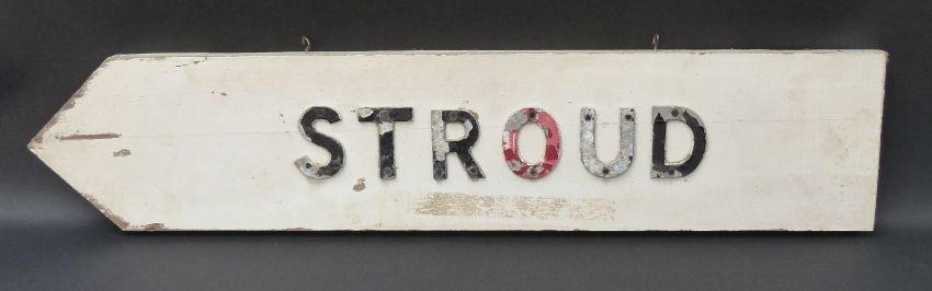 A vintage 'Stroud', Gloucestershire road sign with wooden board and aluminium letters (length overall 78cm)