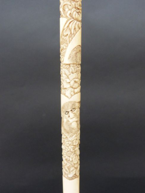 An early 20th C parasol the carved ivory handle with monkeys and signed, 83cm long