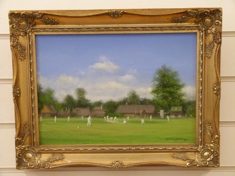 Jack Russell oil on canvas Harry Worcesters XI signed and dated '92 lower right, titled verso, 24x34cm with photographs of Imran Khan at the watch
