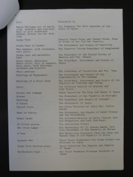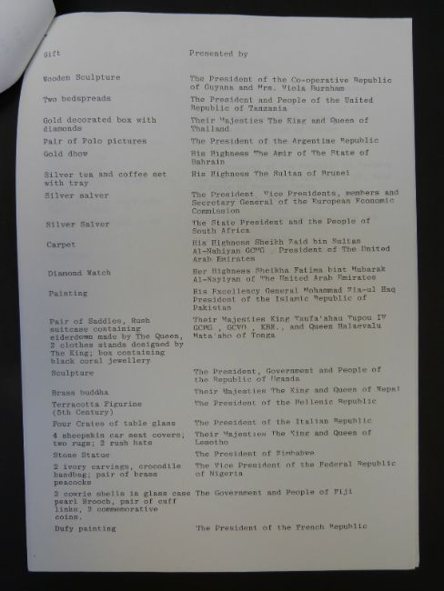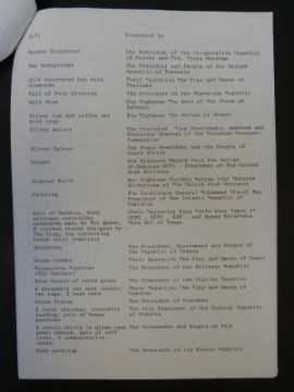 A typed list of wedding gifts presented to their Royal Highnesses Prince Charles and Princess Diana from Commonwealth and foreign countries; an invitation to a preview of an exhibition of the said gifts at St James's Palace and a copy of a memorandum from Prince Charles to "everyone in the presents office" hoping the staff hadn't been driven completely demented by overexposure to mail bags and wonderfully well meaning members of the Great British Public. He also states it must be difficult now all the excitement has died down and everyone else has gone on holiday, don't despair Christmas is near, signed Charles and dated August 28th 1981