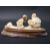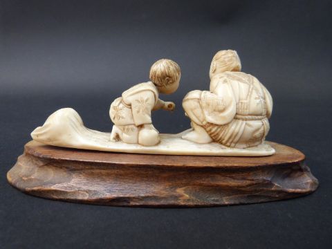 A Japanese Meiji period carved ivory okimono of a child with father, on wooden plinth, 11cm long
