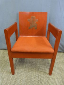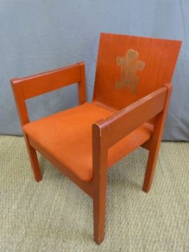 Investiture chair for The Investiture of Prince Charles as Prince of Wales at Caernarfon Castle 1969, designed by Lord Snowdon, made by Remploy of vermilion stained beech with gilt Prince of Wales feather crest to back and original red tweed covered seat - sold to guest Sir William Mars-Jones after the ceremony