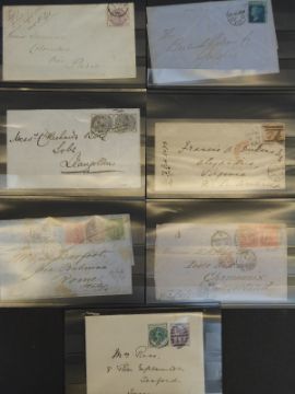 A selection of seven GB line engraved & surface printed stamps on cover, British & overseas mail