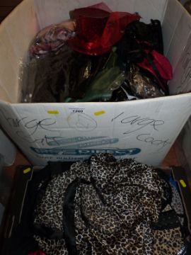 Three boxes of fancy dress wear to include outfits, gloves, hats etc