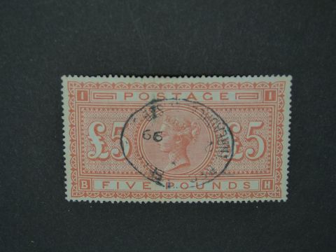 £5 orange on white paper, 1867-83, SG137, used with light central oval Threadneedle street postmark. A fine well centred example