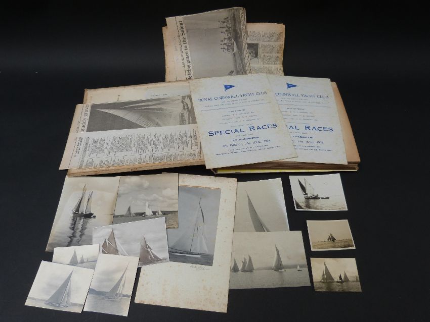 A photograph album featuring Cornish scenes, Dollar Cove, Porthcurno, Kynance, Treen, Various Yachts including Britannia (numerous) Velsheda, Cutty Sark, Porthgwarra, Endeavour and two Royal Cornwall Yacht Club 'Special Races' program 1934, newspaper clippings and loose photographs (it is believed the owner of the album was a professional photographer)