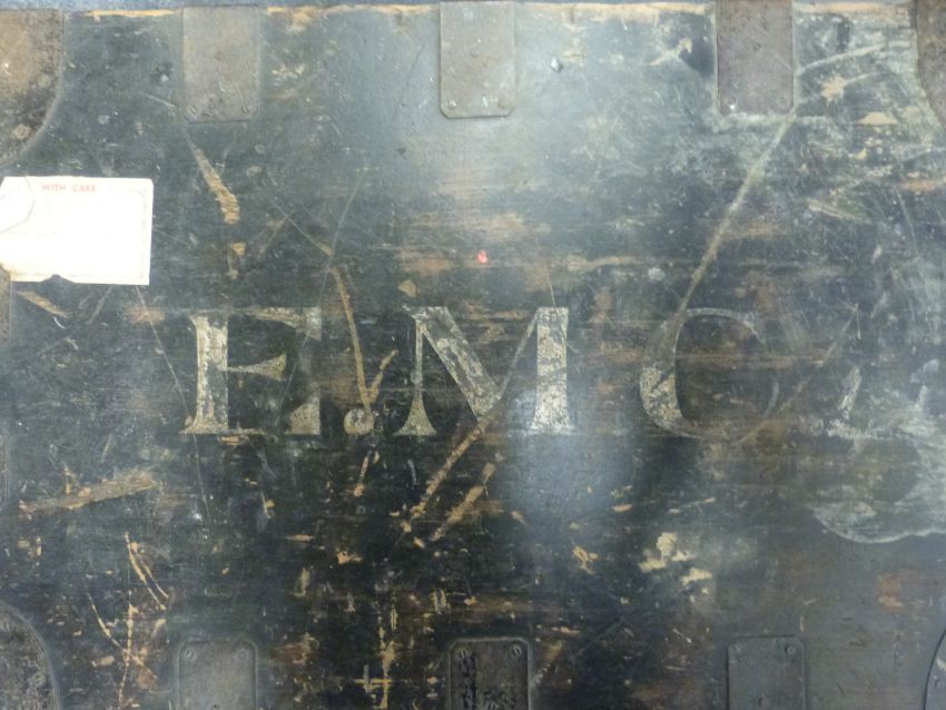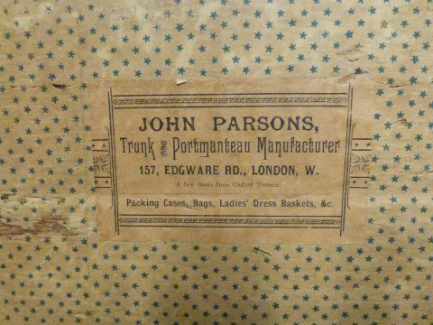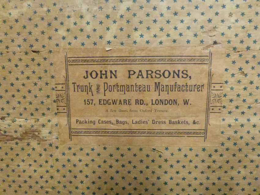 Metal bound chest seaman's chest with John Parsons, trunk manufacturer, London label (H49 x L76 x W48cm)