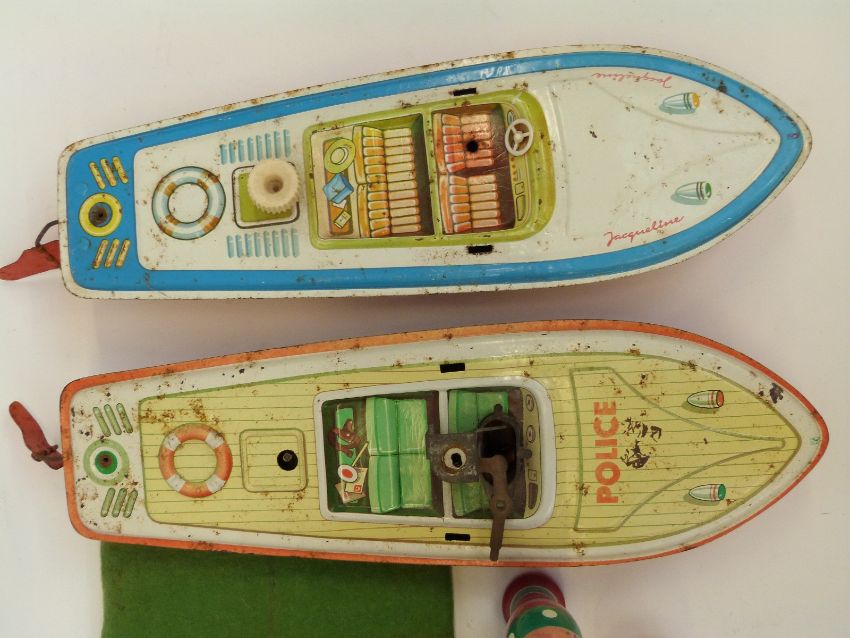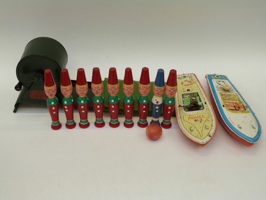 A quantity of vintage toys to include two clockwork boats, a vintage Rolette machine with cloth board and a quantity of vintage painted skittles with ball