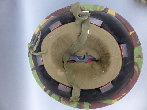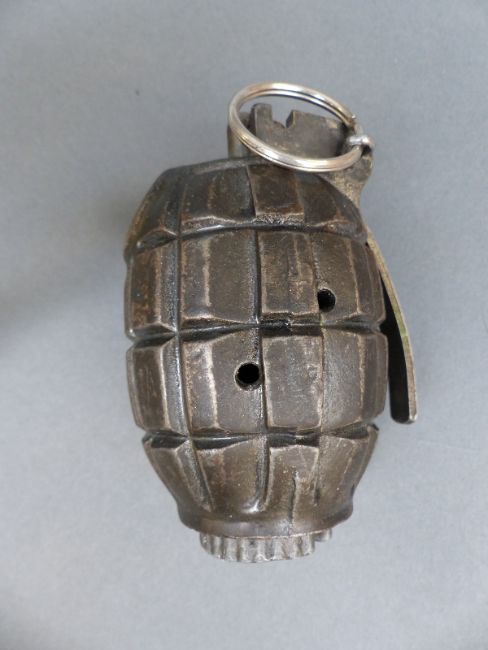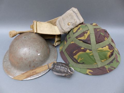 A practice hand grenade marked RBD together with two army helmets, one WWII example marked F&L 1940 MS and a canvas holster on belt.
