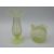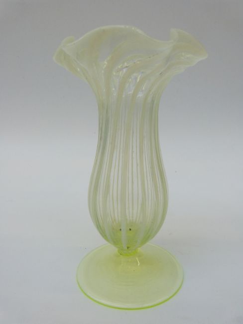 Two vaseline glass straw opal vases both with frilled rims, one on uranium glass foot, 26cm tall