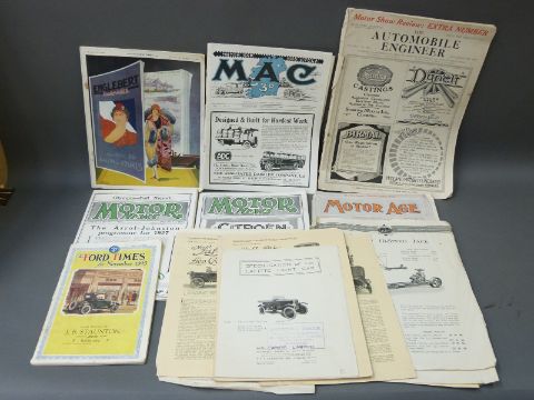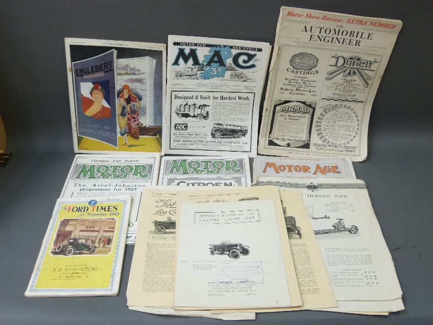 A quantity of vintage car magaines and literature to include Lafitte, The Schneider, Harvey Frost, 1925 Ford Times, 1926 Motor show review etc