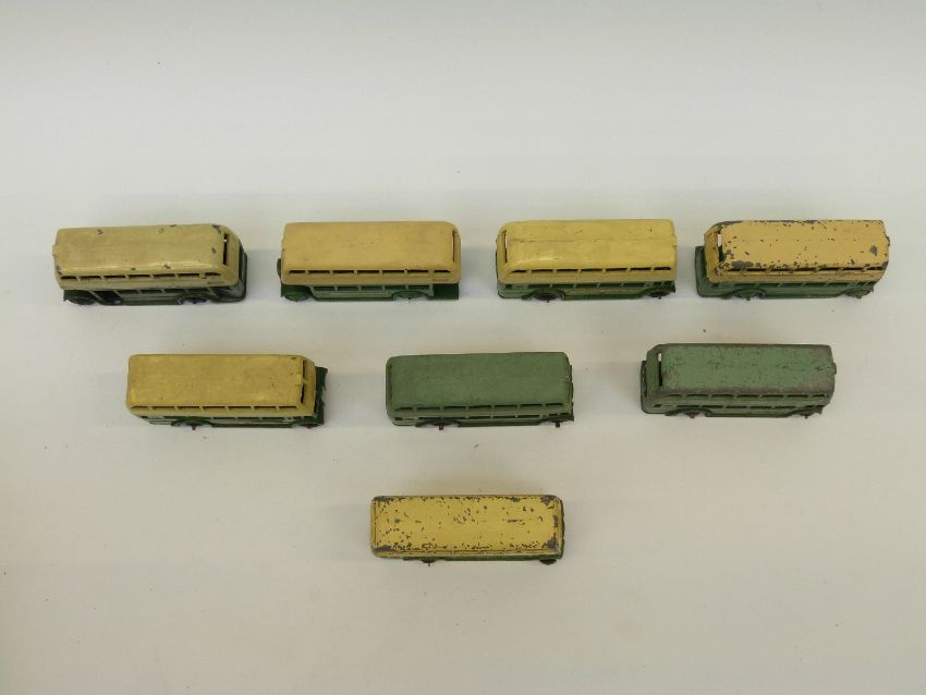 Eight Dinky Toys diecast model double decker buses, six in cream over green and two in two tone green