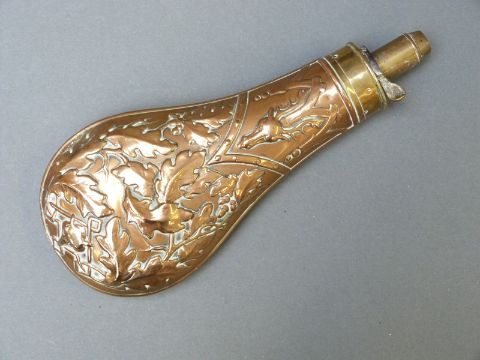 G & J.W. Hawksley copper and brass powder flask with embossed decoration of a mounted stag's head above leaves and foliage, 20cm long.