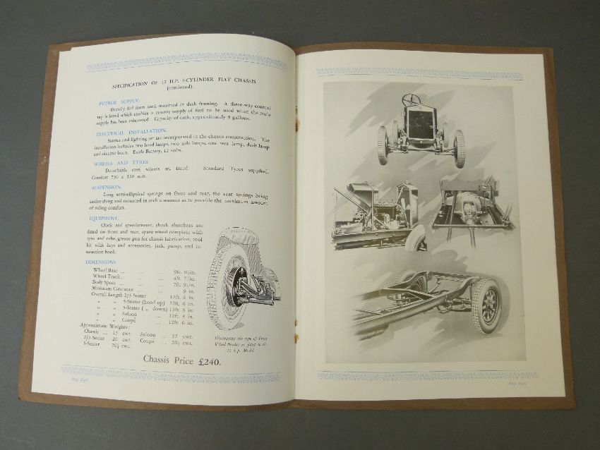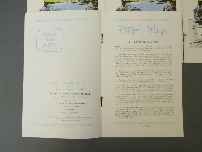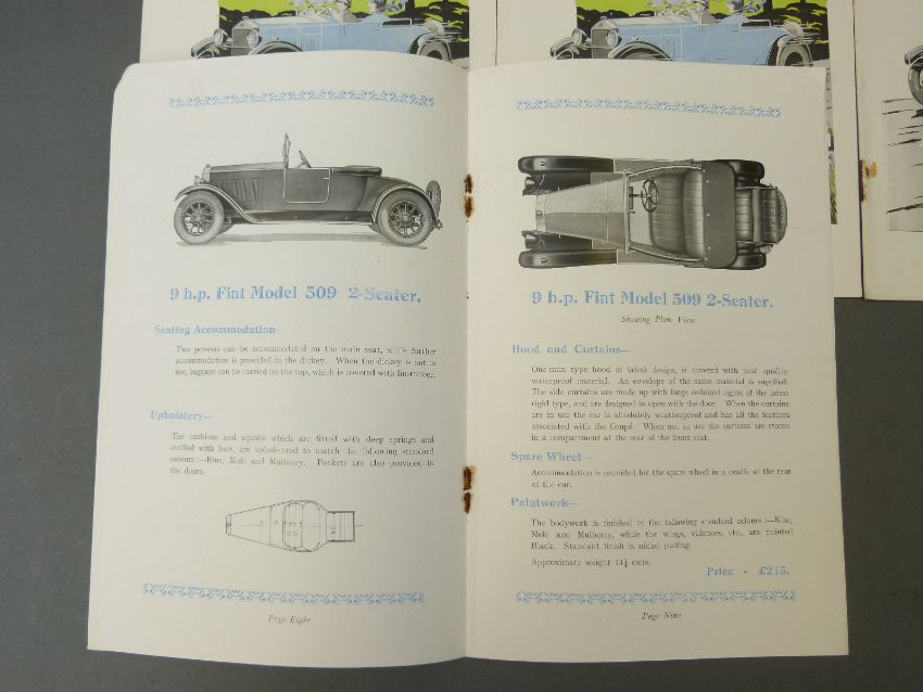 Seven 1920's Fiat vintage car brochures including 9hp and 12hp models