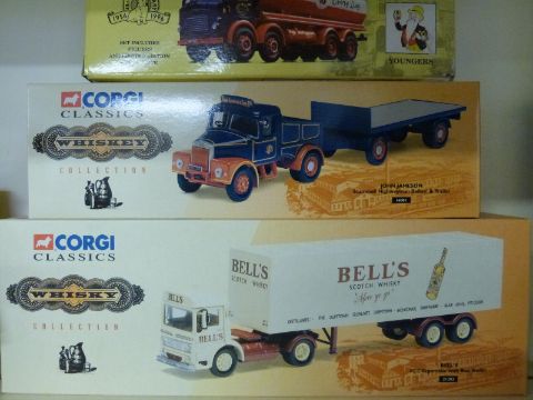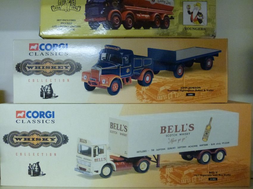 Three Corgi Whisky and Brewery Collection diecast model lorries Scammel Highwayman 16001, AEC Ergomatic 213030 and Leyland Tanker Set 24301, all in original boxes