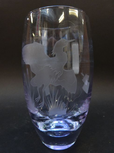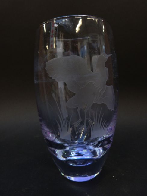 Orrefors Heron glass vase with engraved decoration, signed and named to base, 17.4cm tall