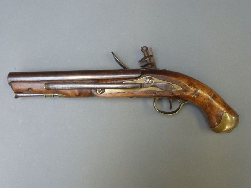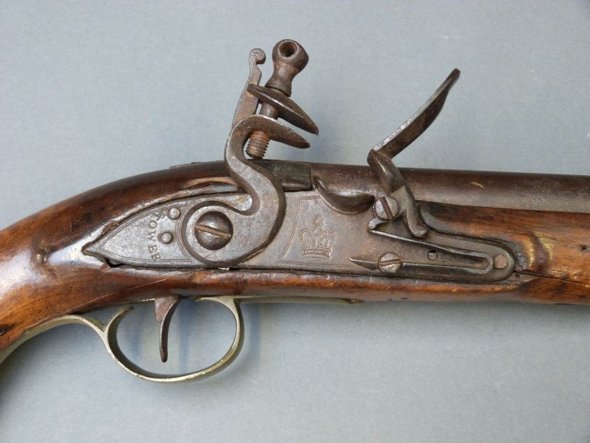 Flintlock hammer action Dragoon pistol with lock stamped Tower and with crown, belt hook, steel ramrod, brass mounts and trigger guard and 8 inch barrel, overall length 38cm.