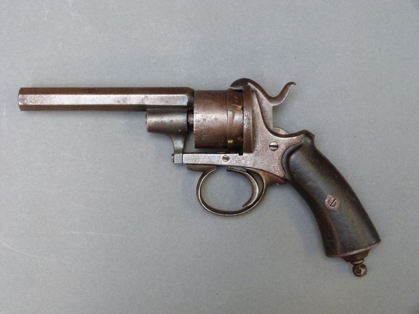 Belgian six shot pin fire revolver with shaped grips, belt hanger to butt and 4.5 inch octagonal barrel, overall length 25cm.